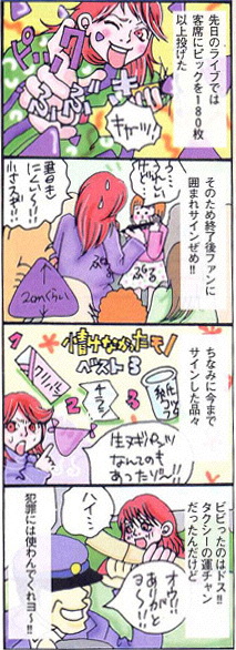 マジックといえば一日に500枚くらいサインし続けてインクのにおいで酔っちゃった事があった。某レコード会社の会議室で。あの時は気持ち悪かったなぁ。まぁ文句ばかり書いてるけどサインするの別に嫌いなわけじゃないんで、皆さんもらいに来て下さい。