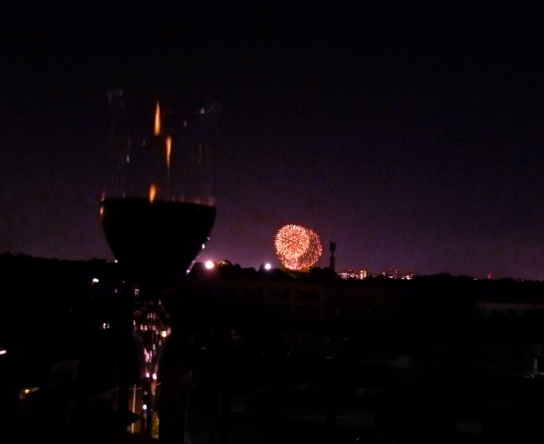 仕事放り出して、ワイン片手にルーフバルコニーから花火見物。